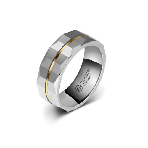 Anel de Tungstênio Prateado Trabalhado com Listra Dourada 8mm (FJ75-8)